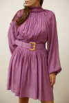O vestido lilás é uma opção elegante e confortável para diversas ocasiões. Possui detalhes delicados como ombro franzido com ombreira e decote fechado com babadinho, que conferem um ar romântico à peça. O elástico na cintura garante um caimento perfeito, enquanto as costas com fechamento em laço no pescoço adicionam um toque de sofisticação. O forro na saia proporciona mais conforto e segurança ao usar a peça. O cinto removível é um detalhe charmoso e versátil, podendo ser usado para marcar a cintura ou removido para um visual mais despojado. A composição é de forro 100% poliéster e tecido 55% viscose e 45% poliéster.