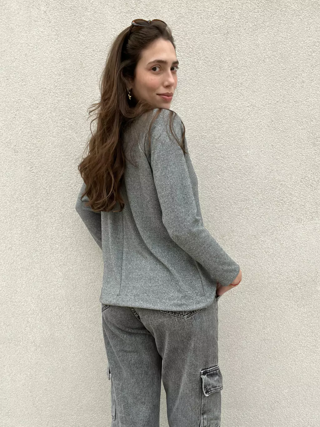 Blusa cinza mesclado de manga longa básica, o modelo dessa blusa é mais curtinho na frente e mais logo nas costas (como mostra as fotos). Blusa não é transparente, básica e tem elastano. Perfeito para usar com calças jeans ou de alfaiataria e ainda combine blazers para compor o look.